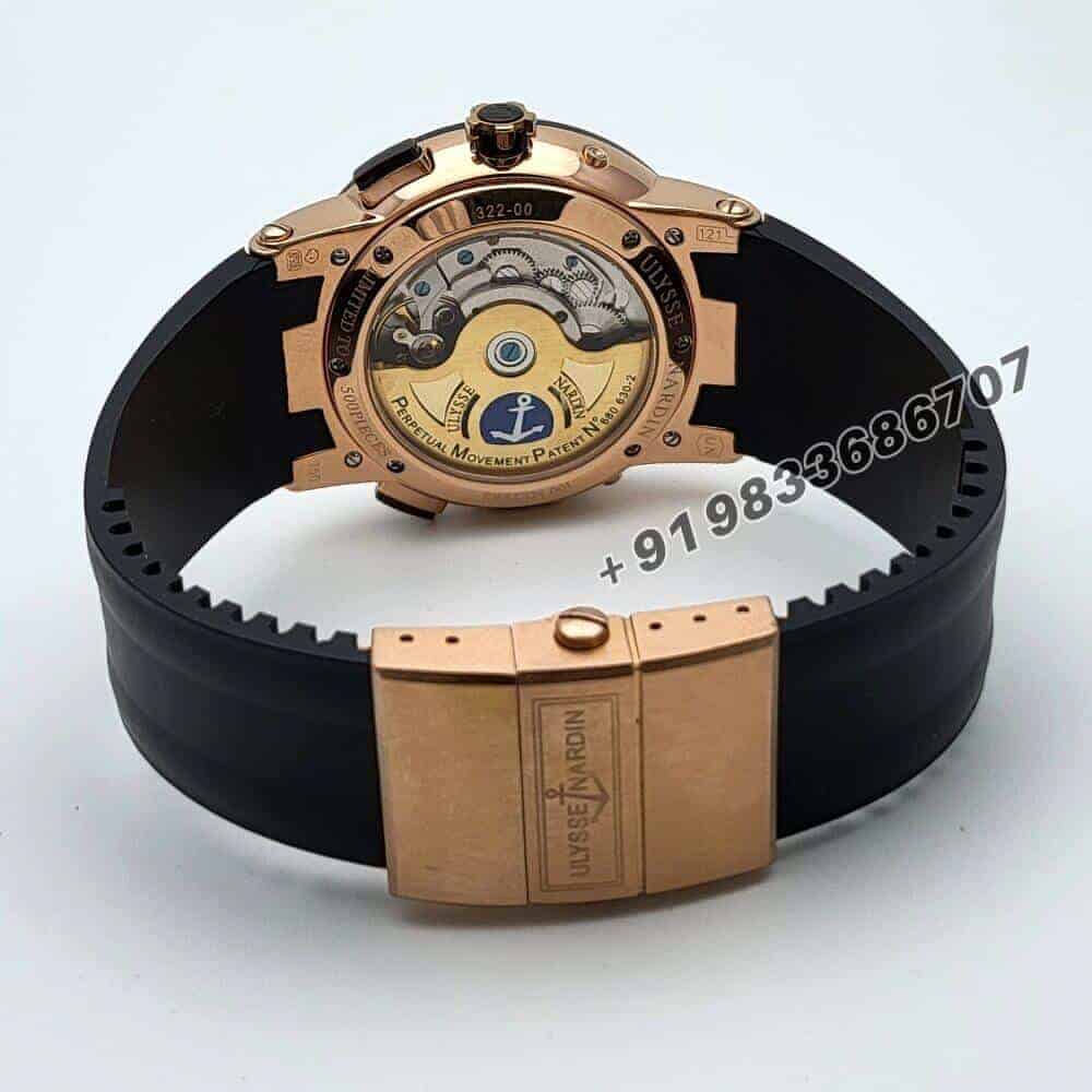 Quality: High Quality Watch Warranty Period: 1 Year Movement: Ulysse Nardin Swiss Automatic Movement Dimension: 43mm Dial Color: Black Dial With Calender Bezel: Ceramic Bezel Glass: Scratch Resistance, Sapphire Crystal Case: Polished Rose Gold Case Back Case: Transparent Back Case Strap: Black Rubber Strap Water Resistance: 100m Box: Comes with Free Normal Watch Box